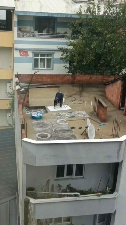Bursa’da barajlar boşalmasıyla sular kesilmeye başladı. Bir yandan da yağmur yağışı başladı. Ancak bu yağışlar barajlar için şimdilik yeterli değil. Belediyenin uyarısı ve kesintilere rağmen bir kadın apartman çatısında halı yıkarken görüntülendi. İlginç anlar çevredeki vatandaşların dikkatinden kaçmadı. Yağmurun altında çatıda halı yıkayan kadını görenler, o anları cep telefonlarıyla kaydetti.
