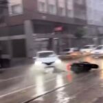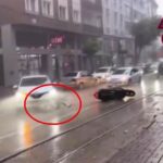 Bursa’da yağmurun şiddetini çeken vatandaşın önünde motosiklet ile araç çarpıştı. Kaza sonrası motokuryenin kafası aracın lastiğine çarptı, facia ucuz atlatıldı.