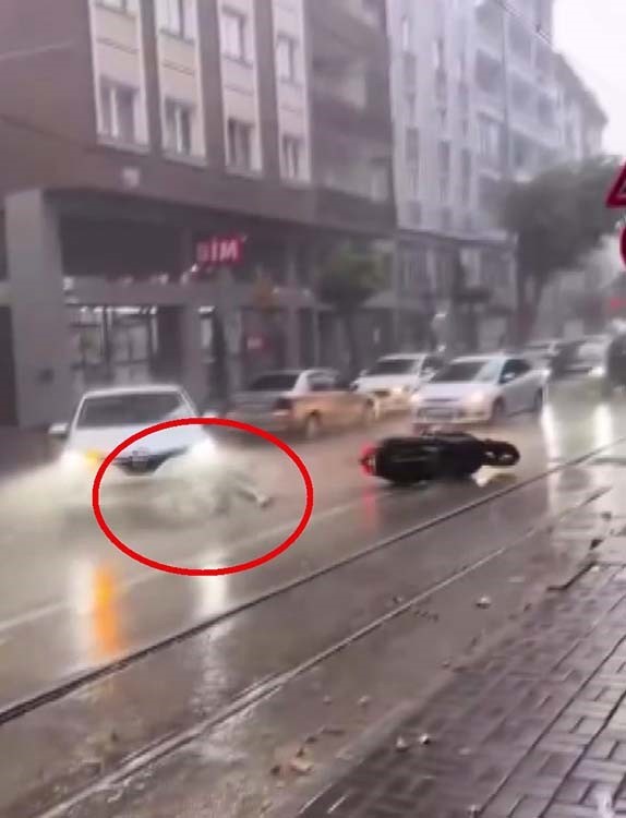 Kaza, merkez Yıldırım ilçesi Hocataşkın Mahallesi İncirli Caddesi’nde meydana geldi. Cuma günü aniden bastıran yağmur hayatı durma noktasına getirdi. Yağmurdan en çok etkilenenlerden biri de motokuryeler oldu. İncirli Caddesi’nde seyir halinde olan motokurye önüne aniden araç çıkması sebebiyle frene yüklenince yağmur nedeniyle kaydı. Motosikletten yere düşen sürücünün kafası aracın lastiğine çarptı. Araç sürücüsünün o sırada durması ve çevredekilerin bağırması motokuryenin ağır yaralanmasının önüne geçti. Kaza anı o sırada yağmurun şiddetini çeken bir vatandaşın cep telefonu kamerasına yansıdı.