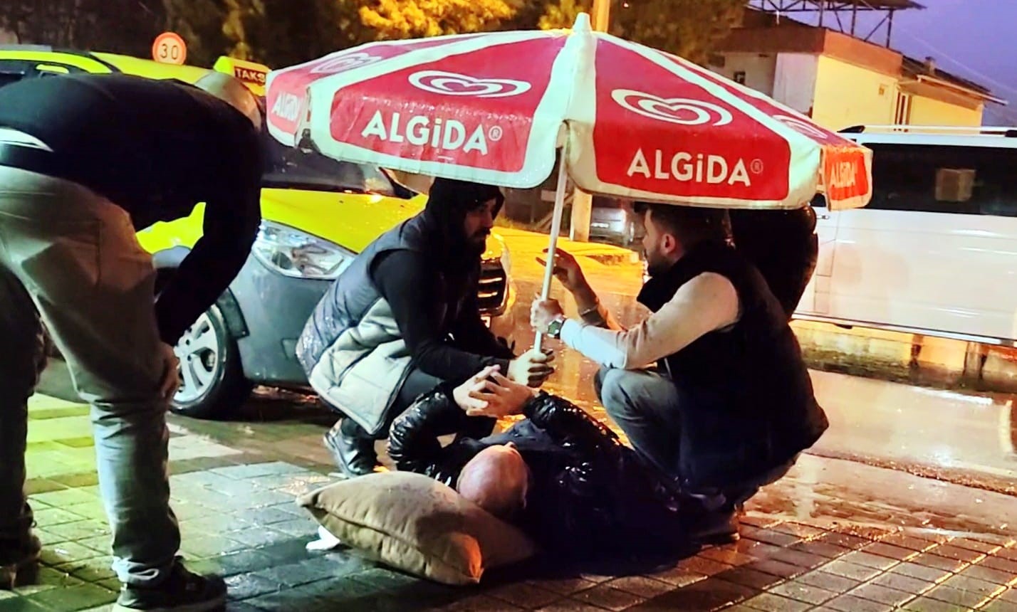 Bursa’nın İnegöl ilçesinde otomobilin çarptığı yaya yaralandı. Yaralı adamı çevredeki vatandaşlar şemsiyeyle sağanak yağıştan korudular.
