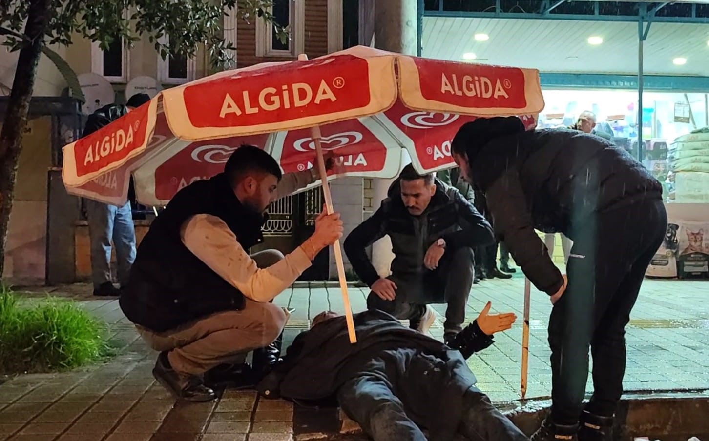 Çarpmanın etkisiyle yere düşen adam yaralandı. Kazayı gören çevredeki esnaflar yardıma koştu. Bir esnaf ise yerde yatan yaralıyı sağanak yağıştan korumak için şemsiye getirdi. Vatandaş yaralıya, ambulansa konulana kadar şemsiye tuttu. Yaralı adam, ambulansla İnegöl Devlet Hastanesine kaldırıldı.