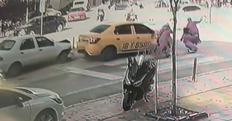 Bursa’nın İnegöl ilçesinde yaya anne ve bebeğine yol veren taksiye arkadan gelen otomobil çarptı. Çarpmanın etkisiyle taksi de anne ve bebeğine çarptı. Yaşanan o korku dolu onlar saniye saniye güvenlik kameralarına yansıdı.