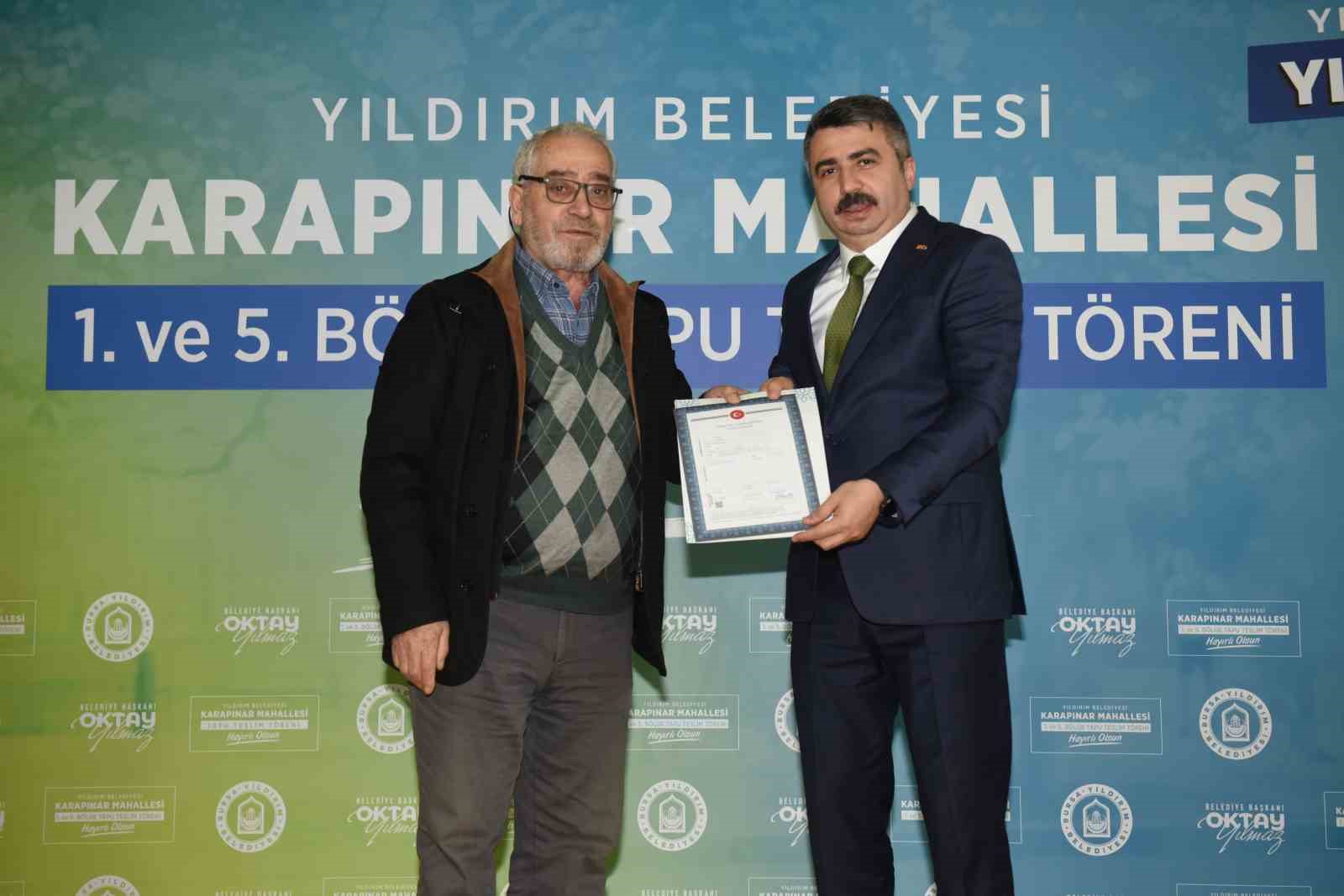 Yıldırım Belediyesi, Karapınar Mahallesi 1. Bölge Geri Dönüşüm ve İmar Uygulaması çerçevesinde, tapu çalışmalarını tamamlayarak bin 503 hak sahibine imar parseli tapularını teslim etti.