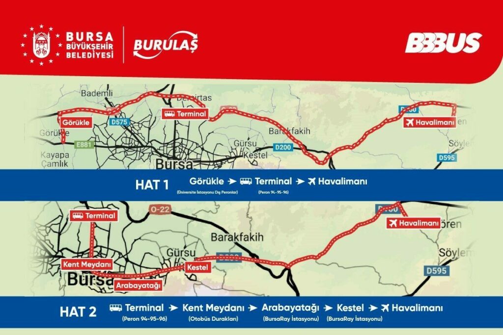 Bursa Büyükşehir Belediyesi, Yenişehir Havalimanı’na daha konforlu ve daha kolay ulaşımın sağlanması için Görükle, Terminal, Kent Meydanı, Arabayatağı ve Kestel gibi önemli noktalardan BBBUS otobüs seferlerini başlattı.