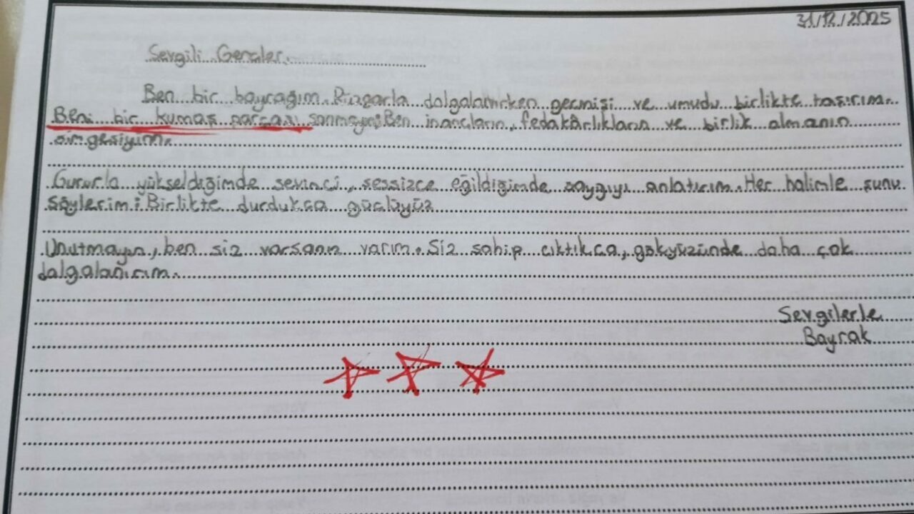 Etkinlikler çerçevesinde Türkçe öğretmeni tarafından öğrencilere “Bayrağın öğrenciye seslenişi” konulu bir paragraf yazma çalışması da yaptırıldı. Çalışma kapsamında 6/D sınıfı öğrencisi Sena Selen tarafından kaleme alınan paragraf, içerdiği duygu ve anlatımıyla dikkat çekti.