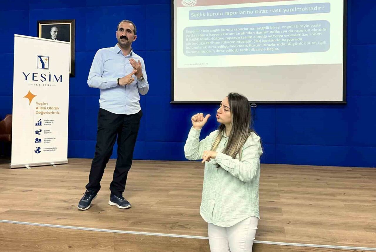 Osmangazi Sosyal Hizmetler Merkezi Müdürlüğü’nden Sosyal Hizmetler Uzmanı Yasin Yıldız’ın konuşmacı olarak yer aldığı etkinlikte, Yeşim Grup çalışanlarına engellilerin sosyal hakları hakkında geniş çaplı bilgiler sunuldu. Aynı zamanda, işitme engelli çalışanlar için de tüm konuşmalar, Bursa Aile ve Sosyal Hizmetler İl Müdürlüğü İşaret Dili Tercümanı Hülya Batır tarafından anlık olarak işaret diline tercüme edilerek bu konuda onların da bilgi sahibi olması sağlandı.