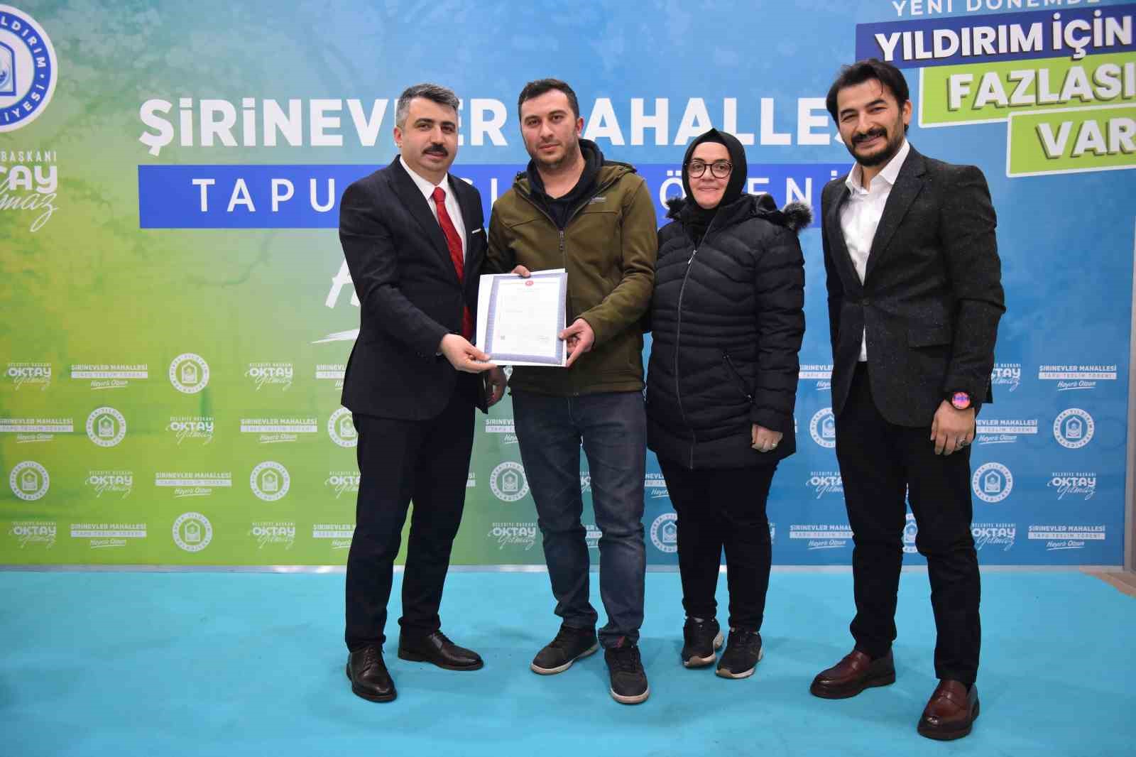 Yıldırım Belediyesi, Karapınar Mahallesi’nin ardından Şirinevler Mahallesi’nde tapu çalışmalarını tamamlayarak bin 254 hak sahibine imar parseli tapularını teslim ederken, 76 bin metrekarelik alanı kamulaştırma bedeli ödemeden Yıldırım’a kazandırdı.