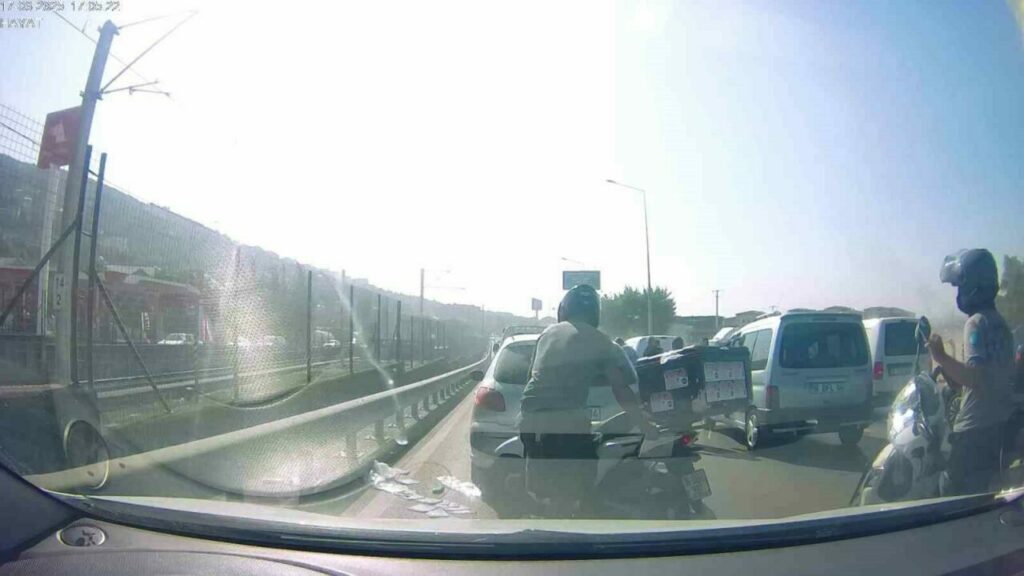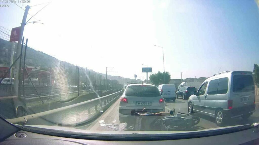Osmangazi ilçesi İzmir Yolu Caddesi üzerinde meydana gelen olayda, yoğun trafikten kaçmak isteyen motosikletlilerin trafik kurallarını hiçe sayarak şerit değiştirdiği ve araçların arasından ilerledikleri görüldü. İki motosikletlinin birbirine çarpmasıyla yere savruldukları anlar araç içi kamerasına yansırken, savrulan sürücülerin yardımına çevredekiler koştu. Şans eseri ufak sıyrıklarla atlatılan kazayla ilgili tahkikat başlatıldı.