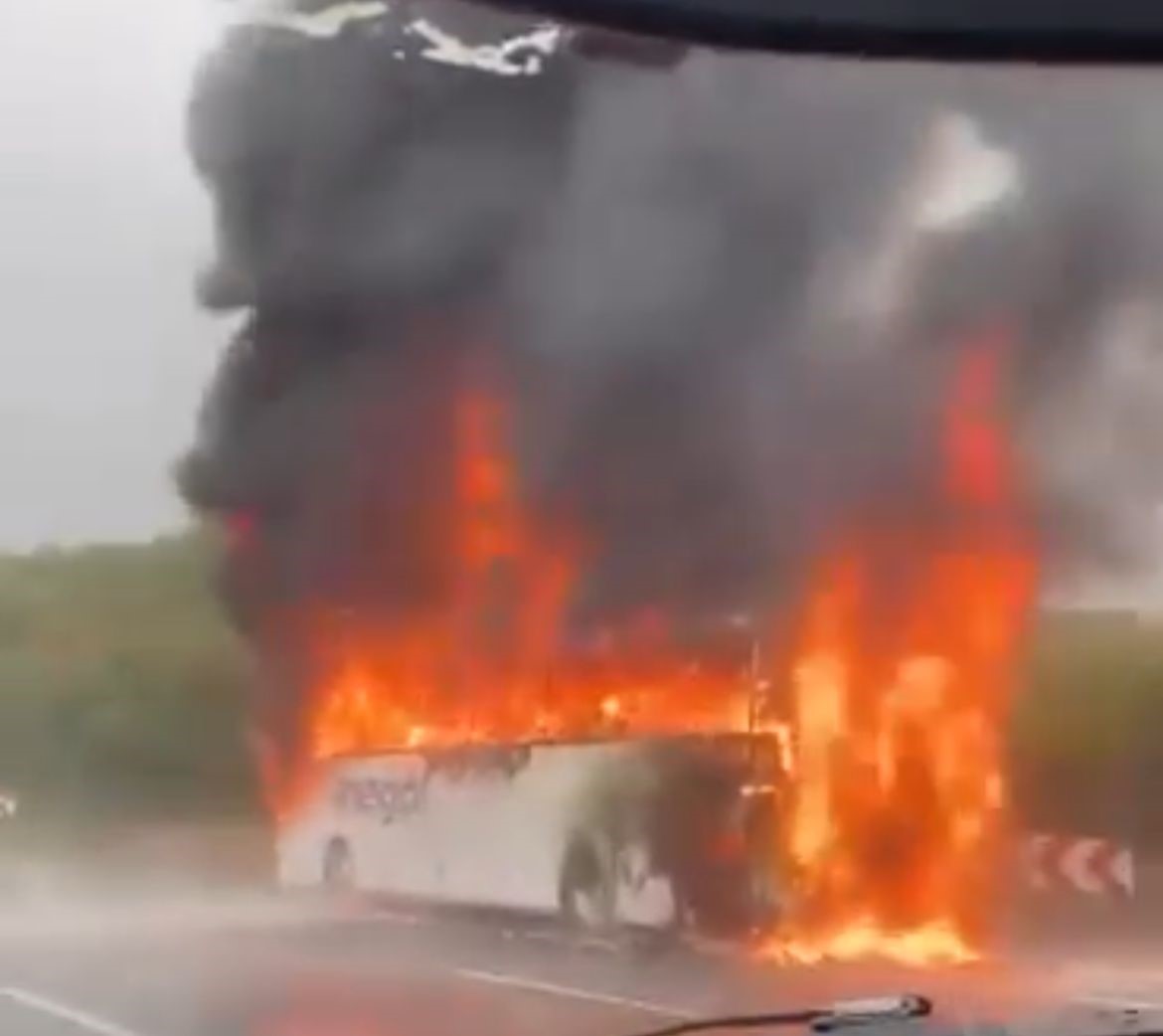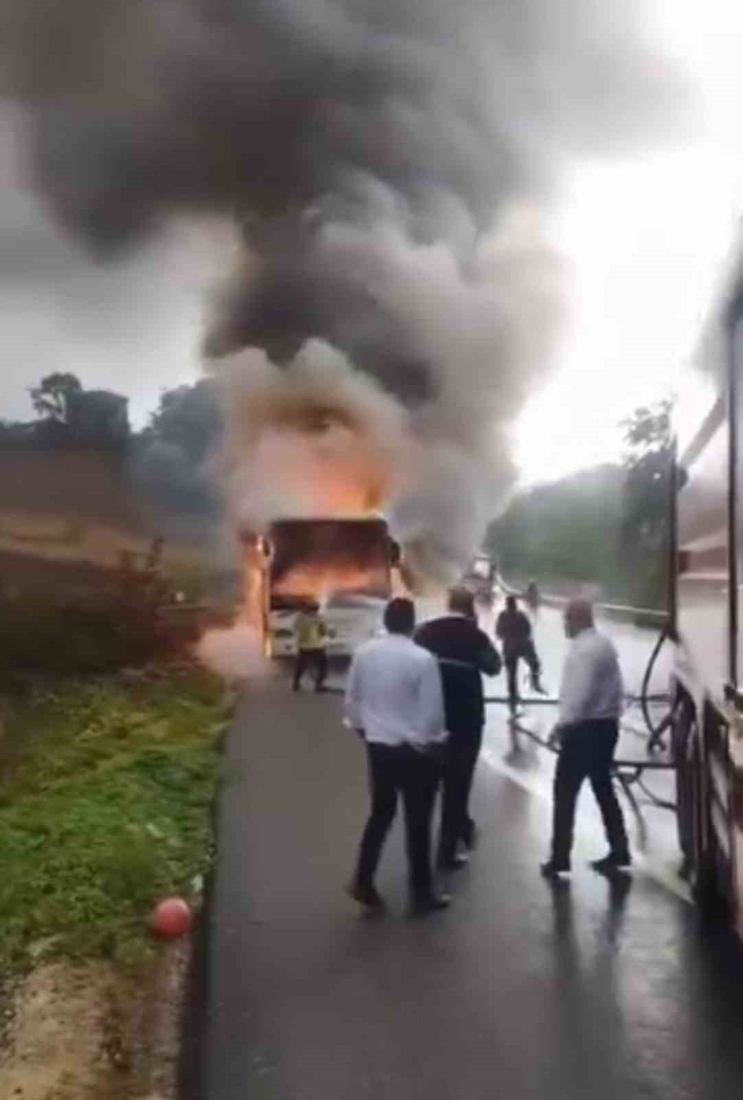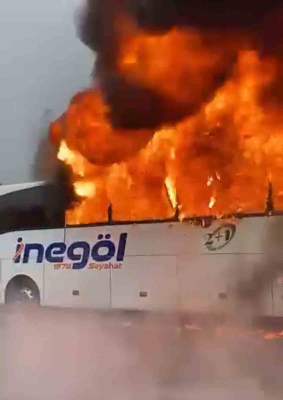Bursa’nın İnegöl ilçesinde yolcu taşıyan İnegöl Seyahat’e ait yolcu otobüsü motor kısmından arıza yapınca alev alev yandı. Yolcuların tahliye edildiği olayda polis olayla ilgili çalışma başlattı.