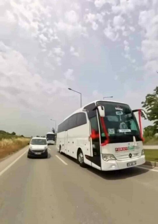 Bursa’da düğün aracı olarak yolcu otobüsünü tercih eden damat ve gelinin yakınları trafikte dikkat çekerken, konvoyda yer alan diğer otomobil sürücüleri ise trafikte tehlikeli hareketler yaparak hem kendilerini hem de diğer sürücüleri riske attı. Bursa’da düğün konvoyunda yer alan süslenmiş bir otobüs dikkat çekti. Düğün aracı gibi süslenen otobüsle yapılan şehir turu ilginç anlara sahne […]