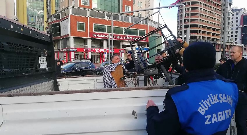 Bursa’nın merkez Osmangazi ilçesi 15 Temmuz Demokrasi Meydanı’nda izinsiz tezgah açmaya çalışan satıcılarla zabıta ekipleri müdahale edince, ufak çaplı tartışma çıktı. Tartışmanın ardından zabıta ekipleri tezgahlarda bulunan ürünleri satıcılara boşalttırdı. Tezgahlar boşaltıldıktan sonra tek tek zabıta ekipleri tarafından tezgahlara el konuldu. Tezgahlara el koyan zabıta ekiplerinin bölgeden uzaklaşmasının ardından satıcılar kendi aralarında tartışmaya başladı ve kısa süre sonra olay yerinden uzaklaştı.