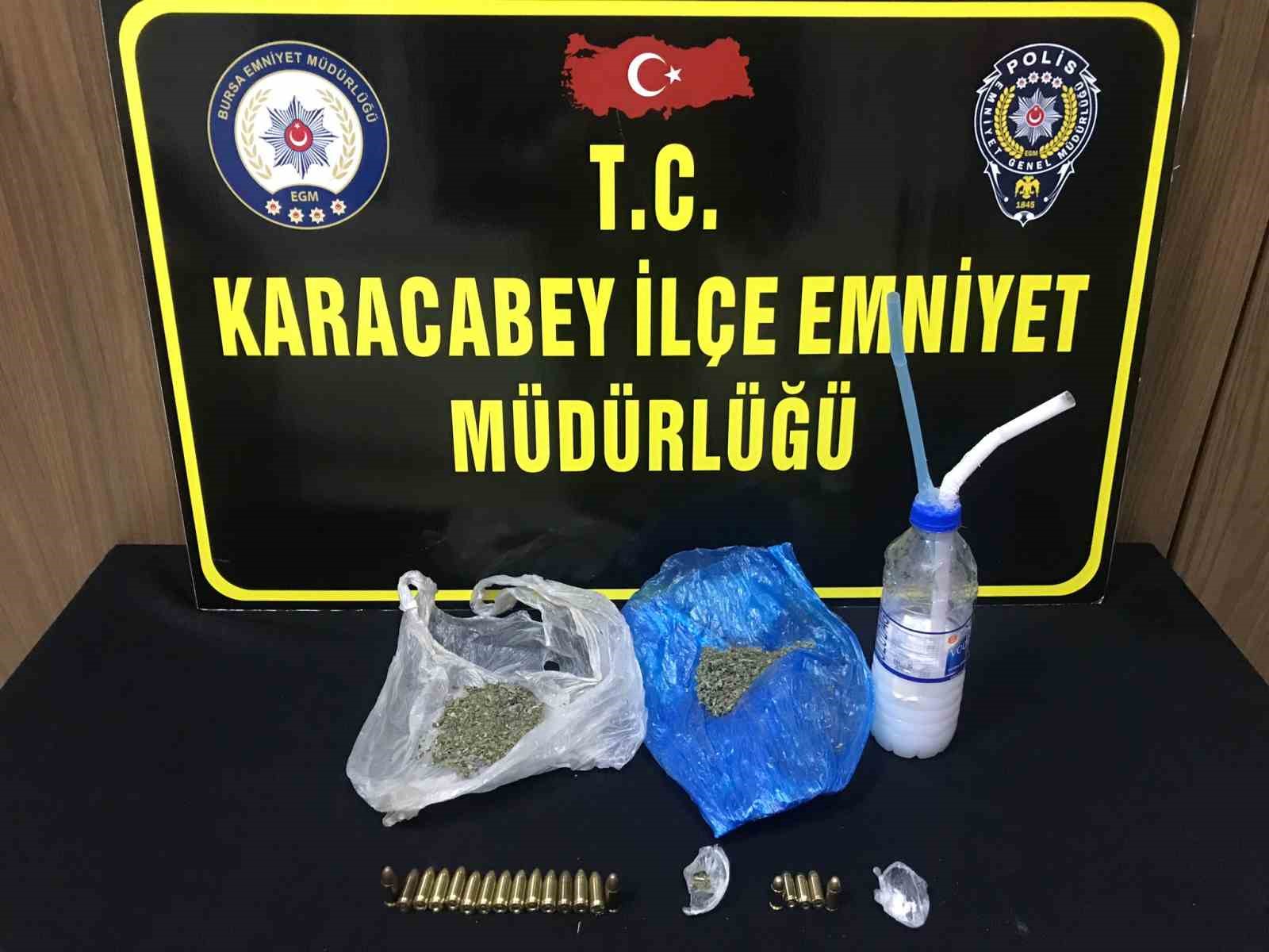 Karacabey İlçe Emniyet Müdürlüğü Asayiş Büro Amirliği ekipleri, uyuşturucu ticareti yaptığı belirlenen E.K. (47)’yi teknik takibe aldı. Polis ekiplerinin yaptığı teknik ve fizikî takip sonucunda şüphelinin üzerinde yapılan aramada, esrar, 1 adet ruhsatsız tabanca ve 5 adet fişek ele geçirildi. Şüpheli E. K.’nın ikamet adresinde yapılan aramada ise kannobinoid (bonzai), methamfetamin, esrar ve 20 adet fişek ele geçirildi.